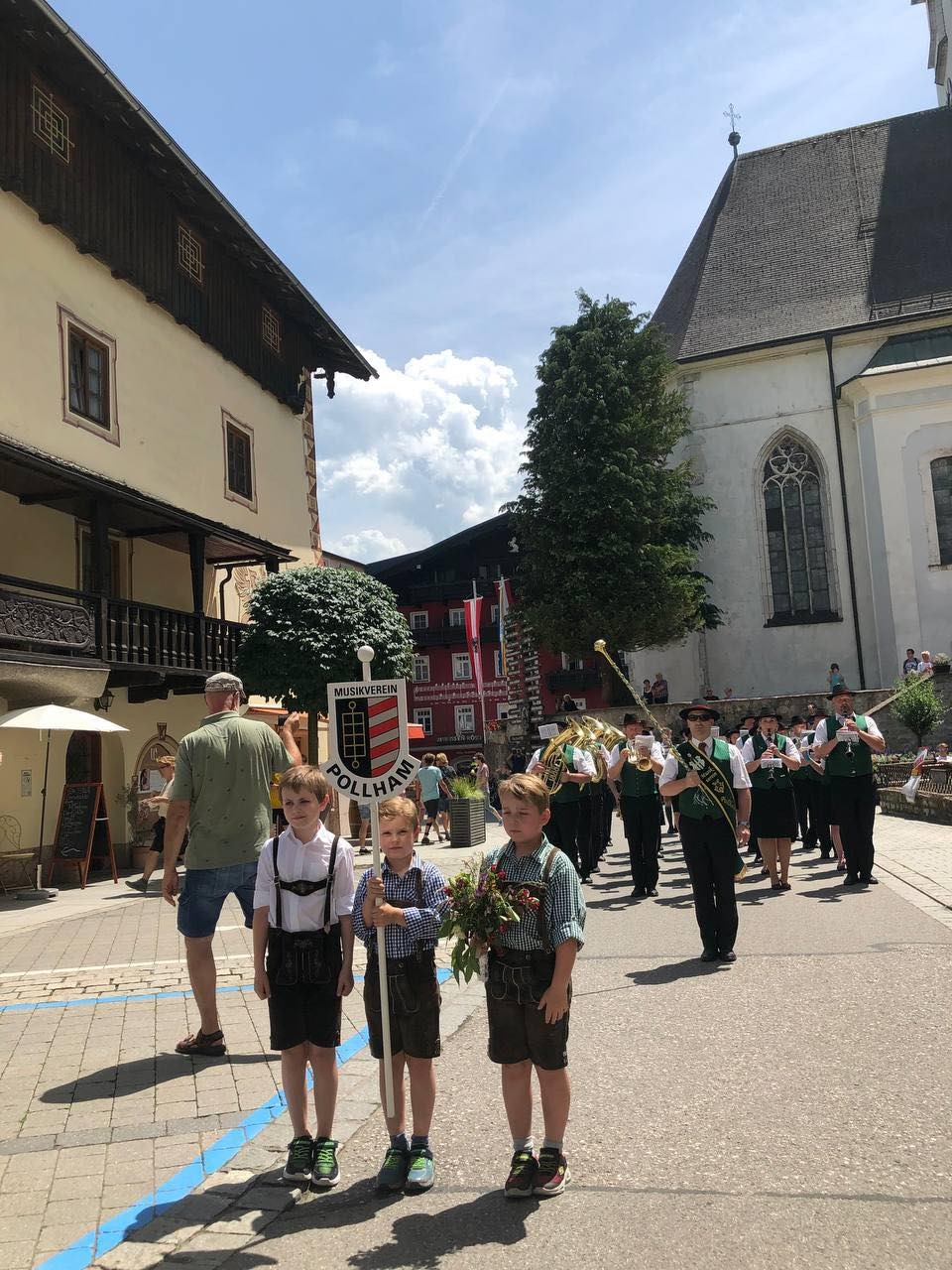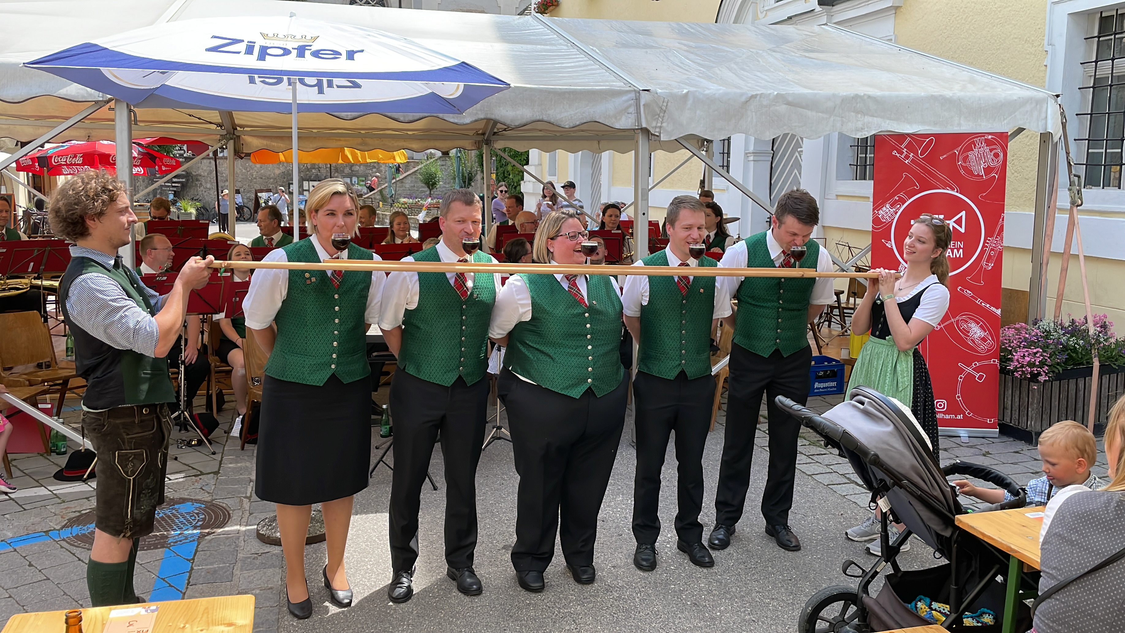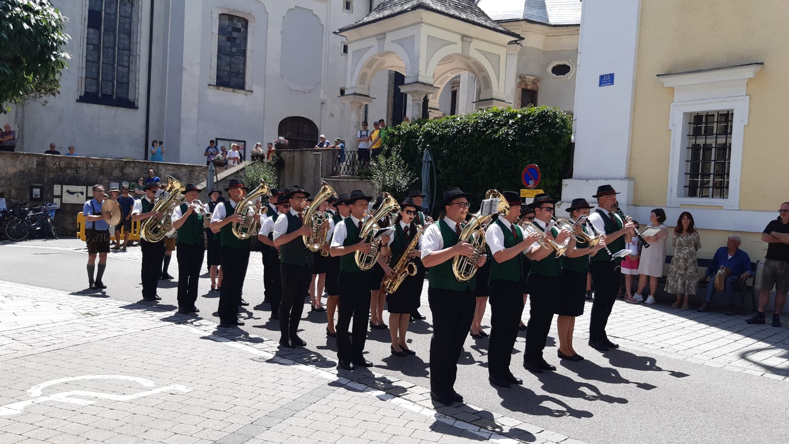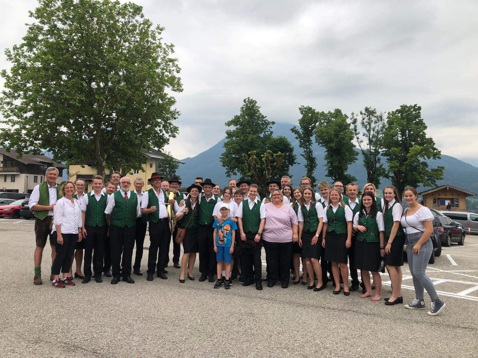 Nach dem musikalischen Einmarsch in den Ort nahmen wir auf der Bühne Platz und durften die Festgäste mit einem bunten Programm aus Märschen und Polkas unterhalten. Unter der Leitung von Kapellmeister-Stellvertreterin Iris Köllerer hatten wir richtig viel Spaß bei der musikalischen Gestaltung dieses Frühschoppens und waren in unserer Motivation nicht zu bremsen. Im Anschluss ließen wir diesen Tag mit gutem Essen und kühlen Getränken gemütlich ausklingen. Vor unserer Abreise mussten wir den Gastgebern in St. Wolfgang aber noch zeigen, wie man richtig feiert und so ließen wir es uns nicht nehmen, bei unseren Lieblingsliedern auf die Bierbänke zu steigen und fest mitzuklatschen. Auch auf der Heimreise ließ unsere gute Laune nicht nach und so wurden verschiedenste Gstanzl zum Besten gegeben und so dem aufkommenden Unwetter getrotzt.